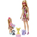 Набор игровой Barbie 2 куклы + 3 питомца GTM82 Малышка Челси отмечает День Рождения, поэтому кукла Барби приглашает всех юных мечтательниц присоединиться к веселью и поздравить ее сестренку. Не удивляйтесь, но в числе гостей вы встретите забавного жирафа, очаровательного слоненка и озорную обезьянку! Куклы Барби и Челси одеты в яркие модные платья, отлично подходящие для дружеской вечеринки, а тематические аксессуары, такие как торт и коробка с подарком, позволят придумать множество увлекательных