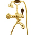 Назначение: ванна+душ • Конструкция: однорычажный • Монтаж: вертикальный • Материал: покрытие - золото • Подводка: жесткая • Монтажные отверстия: 2 отверстия • Форма излива: традиционная • Душевая лейка в комплекте: есть • Держатель для душевой лейки: на смесителе