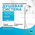 состоит из: верхнего душа, ручного душа, душевого шланга, держателя ручного душа; верхний душ Vernis Blend 200 1jet; размер душевой лейки верхний душ: 205 мм; верхний душ с типом струи: Rain; шаровой шарнир: регулируемый угол верхнего душа; ручной душ с типом струи: Rain, IntenseRain; регулируемый по высоте слайдер с кнопочным фиксатором; длина держателя верхнего душа: 400 мм; максимальный расход при 3 барах: 14,6 л / мин; рабочее давление: мин. 1 бар / макс.