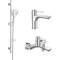 1) Смеситель для умывальника с термостатом; 2) Смеситель для ванны/душа с термостатом; 3) Душевой гарнитур: трёхрежимный ручной душ 110 мм с силиконовыми наконечниками и кнопочным переключением, штанга 900 мм с возможностью установки в старые отверстия (VARIO), растягивающийся шланг 1500-1800 мм, быстросъемная мыльница.
